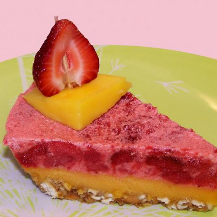 Using 4-inch wooden skewers, place strawberry half and mango slice on each of 10 skewers. Sprinkle with coarse sugar. Place skewers into top of dessert for garnish. To serve, cut into wedges.